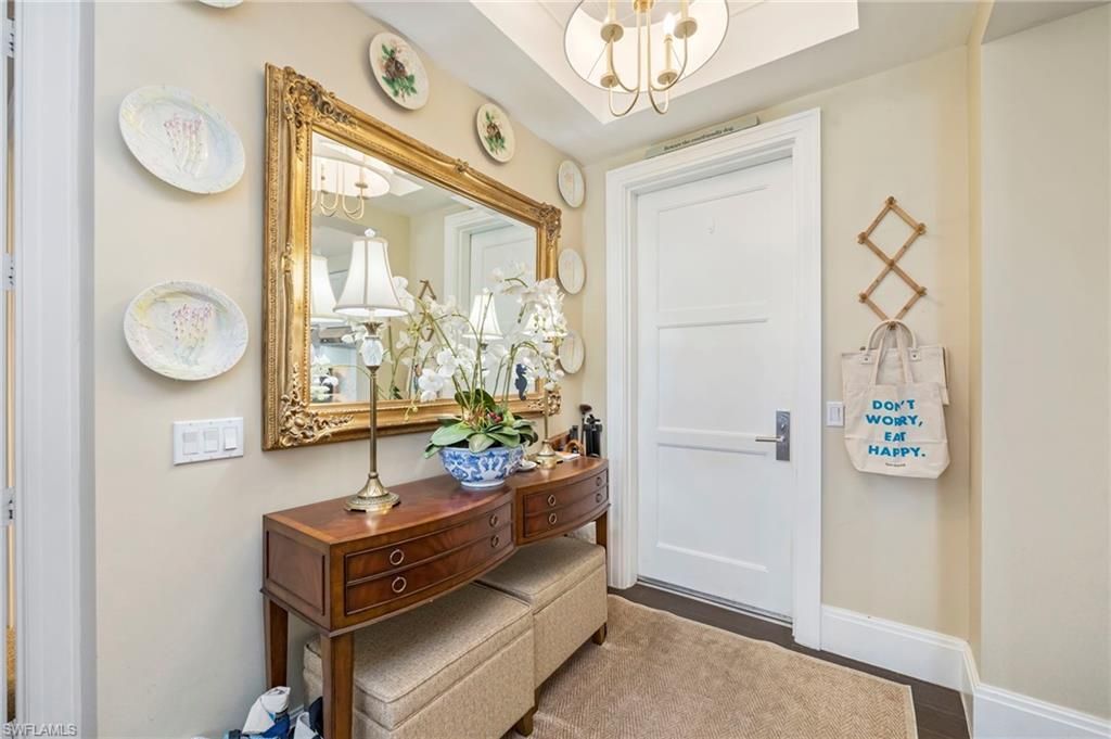 Motivated seller—an exceptional opportunity to own one of Naples Square’s most coveted courtyard-level residences. This exquisite, partially furnished condominium seamlessly blends luxury, convenience, and timeless British West Indies style, offering an elevated indoor-outdoor lifestyle in the heart of downtown Naples and in a pet-friendly community. One of only 10 courtyard residences per building (out of 73), this home features an expansive 650 sq. ft. private lanai, perched more than 10 feet above street level to ensure privacy, tranquility, and peace of mind. Designed as a true extension of the living space, the lanai is ideal for both entertaining and relaxation, featuring two chaise lounges, multiple seating areas, and al fresco dining for six. Importantly, the residence remained high and dry through every storm season, further enhancing its exceptional value. Inside, refined craftsmanship and thoughtful design are evident throughout. Highlights include Farrow & Ball English paint, a striking mother-of-pearl kitchen backsplash, quartzite countertops, and high-end KitchenAid appliances in the gourmet kitchen. The open-concept living and dining areas are enhanced by built-in cabinetry and motorized shades, creating a sophisticated yet comfortable atmosphere. A spacious den—appointed with a Ballard Designs daybed and tall closets—offering versatility as a home office or guest retreat. The primary suite is a serene sanctuary, featuring a generous walk-in closet plus an additional closet and a spa-inspired bath with dual vanities and an oversized walk-in shower. The guest ensuite bedroom, furnished with a stylish Ballard queen bed, is equally inviting, while elegant Thibaut wallpaper adds a refined touch to the guest bath and den. This partially furnished residence (see inventory list) also includes a well-appointed laundry room with a stackable washer and dryer, laundry sink, extra refrigerator/freezer, and a coffee/microwave bar. The home conveys with one reserved garage space and storage unit, along with access to additional open parking within the secure, gated garage. Step through the garden-level flowering pergola and enjoy Naples Square’s resort-style amenities, including a pool, spa, fire pit, outdoor grilling area (grills are across the garden from this unit), and Club Room—all just moments from your door. Ideally located in downtown Naples’ Design District, this residence is within walking distance of world-class shopping, fine dining, and cultural attractions. Whether as a full-time residence or a seasonal retreat, this exceptional home delivers a lifestyle of elegance, security, and effortless sophistication.
