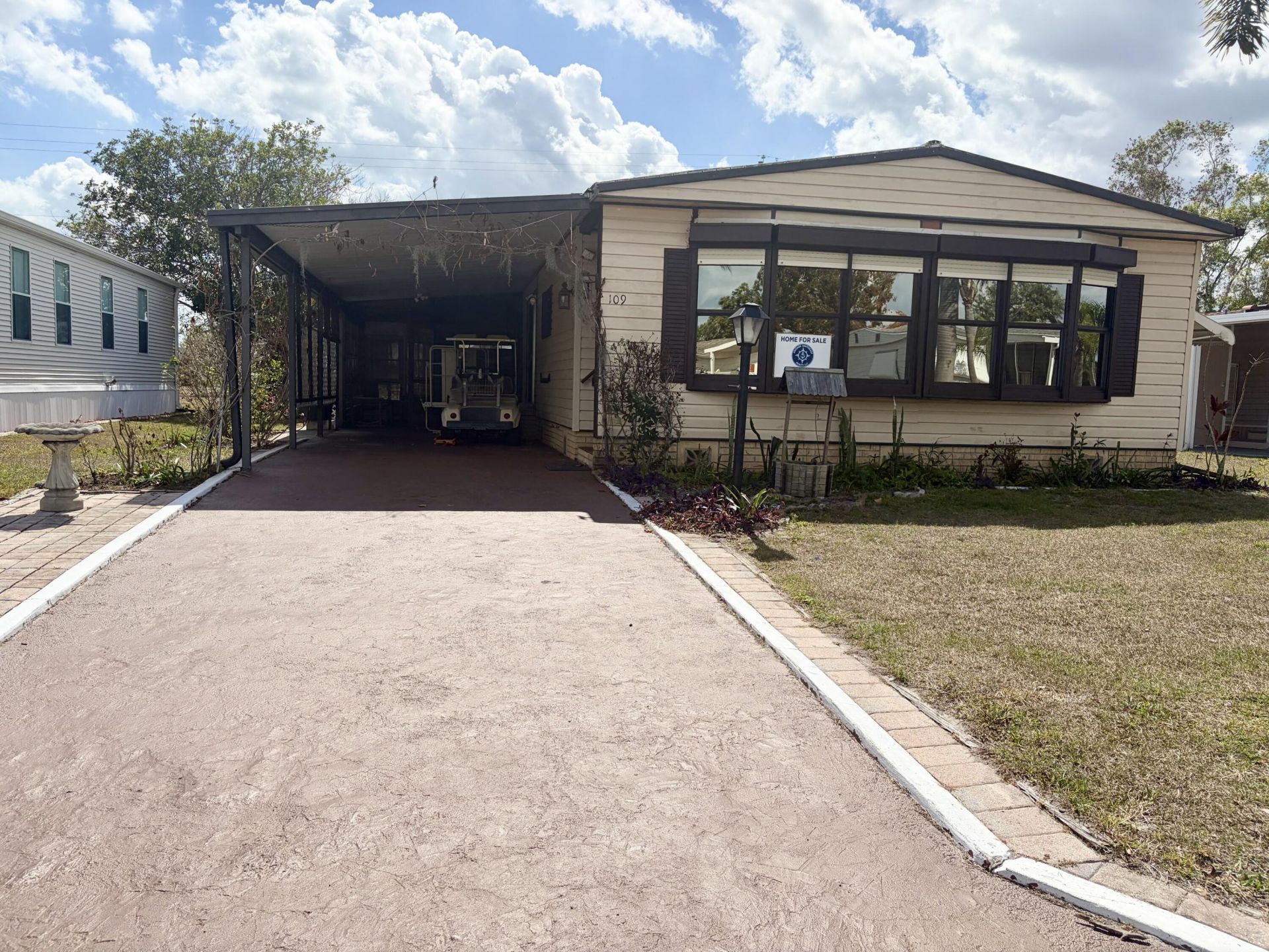 Welcome to 109 East Caribbean in a great 55+ golf community with loads of amenities. This spacious 2-bedroom 2 bathroom is nestled in a great location with no neighbors behind backing up to a LARGE FIELD area (great for leisurely enjoyment). There is a large, screened area for those morning coffee or evening cookouts and golf cart included! This home comes with a hydraulic lift at the side entry just off the driveway. The large bedroom located in the back of the home with a large walk in closet and private en suite. The guest room is just down the hall with additional bath with tub. The laundry has newer washer and dryer and a freezer and great storage, but the storage doesnt stop there... 2 large storage sheds at the back of the home for all your extras! There is a big bonus room at the front of the home, currently used as an entry room. This home is PRICED TO SELL as the current owners moving out of state! Make this your home sweet home! Call ME today to schedule your private showing> Serious buyers appreciated.