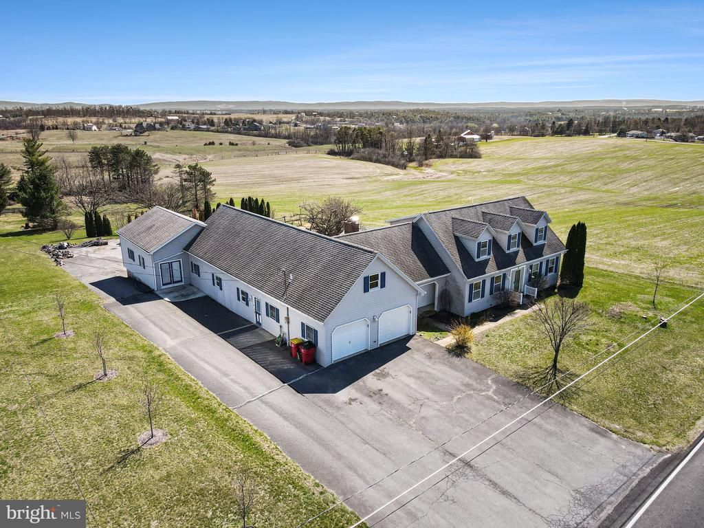 Welcome to this spacious and versatile Cape Cod home, perfectly situated on a generous ¾ acre lot with breathtaking mountain and rolling hill farmland views from both the front and the back. Offering privacy, comfort, and endless possibilities, this property is ideal for those seeking a large multigenerational home, a private estate, or that perfect setup to run a home based business from. Boasting approximately 2,899 sq ft of finished living space plus an additional 720 sq ft of partially finished bonus office space, this home provides ample room for family, guests, or income potential. The flexible bonus area is ideal for an private office, home business, or even an in law suite, complete with its own side access and its own 1/2 bath. Key Features Include: - 5 generously sized bedrooms and 2 full bathrooms + 2 half bathrooms - Two separate garages (total of 3-4 car bays) for vehicles, storage, and hobbies - Oversized kitchen and dining combo featuring a cozy wood-burning fireplace perfect for family meals and entertaining - Extra-large great room with a wet bar, creating the ultimate space for gatherings and relaxation - Abundant natural light from large windows and multiple patio doors that open directly onto a private L shaped covered porch - Unfinished basement with a dedicated workshop area great for projects, storage, or future expansion - Vinyl fenced backyard for safe play, pets, or outdoor enjoyment The main living areas flow beautifully, making this home feel warm and inviting while offering the scale and layout to become a true showplace. With a little vision and updates, this property has incredible potential to be transformed into an impressive estate or comfortable multigenerational living space. Located in a serene country setting, yet conveniently accessible, you’ll enjoy peaceful mornings with sweeping views of mountains and farmland, all while having the space and flexibility modern families desire. Don’t miss this rare opportunity to own a large, view filled home with room to grow, work, and thrive. Schedule your private showing today. This one won’t last long!