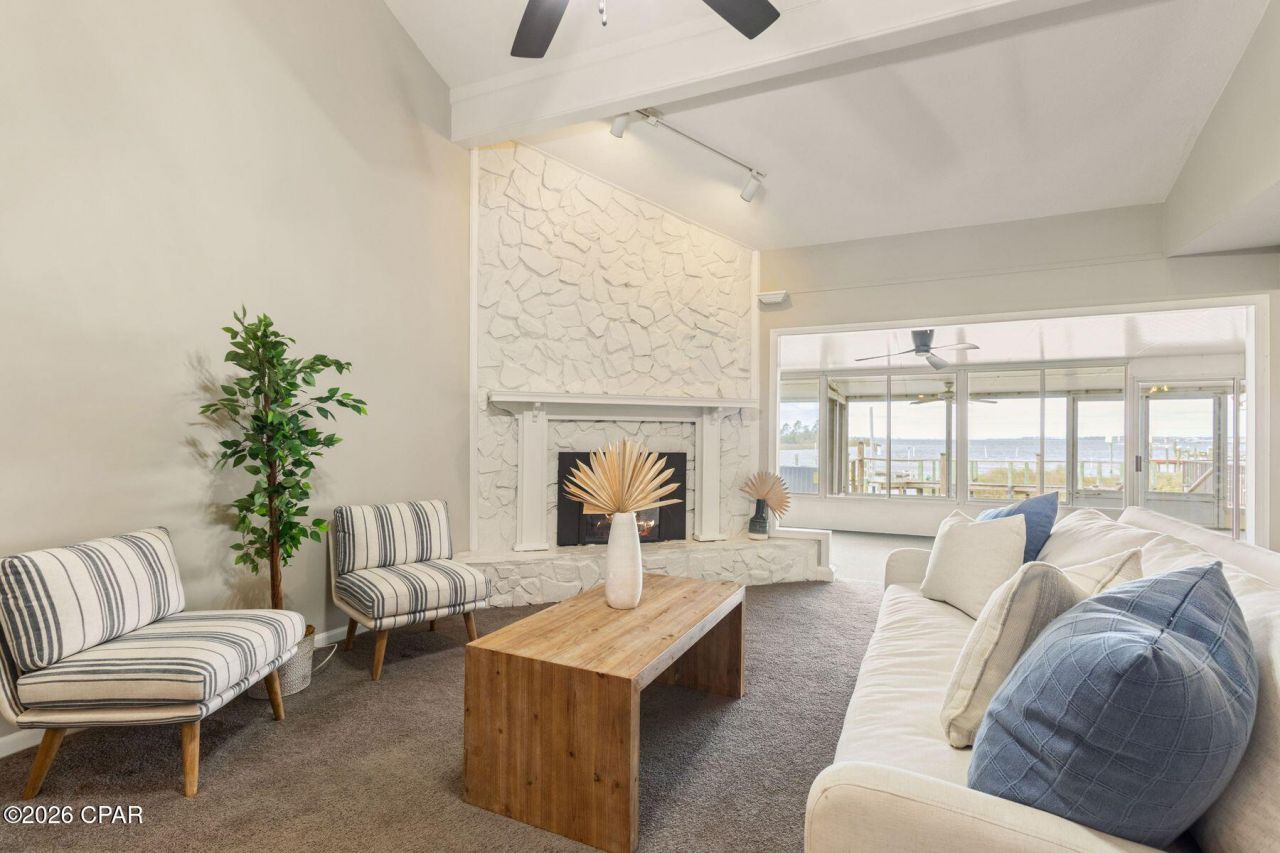 Waterfront living becomes remarkably attainable in this expansive bayfront townhome, where sweeping water views, an impressive private dock and a rare no-HOA setting create an opportunity seldom found at this price point. Soaring cathedral ceilings elevate the formal great room, where an electric fireplace adds warmth and architectural character beneath the dramatic second-story vault. Natural light pours through etched leaded glass accents and the rear wall of windows, drawing the eye toward the bay and the ever-changing colors of the evening sky. The kitchen features elegant Italian porcelain tile and comes fully equipped with all appliances, offering both beauty and everyday functionality. Just beyond the main living area, a glass-enclosed Florida room transitions to a screened sunroom and a generous 26-by-16-foot deck--an ideal sequence of spaces for entertaining, unwinding or simply enjoying the rhythm of the water. Outside, an impressive 85-foot private dock extends into the bay, creating the perfect setting for paddleboarding at sunrise, kayaking along the shoreline, casting a fishing line or relaxing as boats drift by and the sun slips below the horizon. The residence includes three bedrooms, two-and-a-half baths and a two-car garage, along with a charming screened front porch connected by a café-style walkway lined with lighting and flowers. Located within a walkable waterfront community, this property offers the rare combination of space, character and true bayfront living. Panama City continues to grow as one of the Emerald Coast's most appealing waterfront destinations, offering a balance of laid-back coastal living and everyday convenience. Residents enjoy easy access to marinas, waterfront dining, parks and the sugar-white beaches just across the bay, all while maintaining the relaxed pace that makes this area so special.
