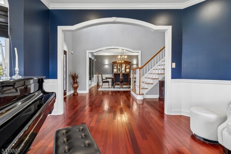 Elegant 4-5 bedroom home with stunning curb appeal, soaring two-story foyer, and dramatic great room, centrally located in New Jersey with convenient access to multiple hospitals, universities, major highways, shopping, and dining. The main level offers an updated gourmet eat-in kitchen with granite counters, center island, stainless appliances, and breakfast bar that opens to a bright window-wrapped sunroom, plus a formal living room, formal dining room, and a dedicated home office ideal for work-from-home or study. Architectural columns and arches, extensive millwork, and abundant natural light give the home a custom, high-end feel throughout. Upstairs, a grand primary retreat features hardwood floors, multiple sitting areas, decorative columns, and an incredible spa-style bath with soaking/jetted tub, separate shower, private water closet, and double-sided fireplace, along with an oversized custom walk-in dressing room/closet. Spacious secondary bedrooms, including a stylish guest suite, are served by well-appointed baths and an open loft/sitting area overlooking the great room. The fully finished basement lives like an entertainment level, with a second full kitchen, large island with seating, lounge and game areas, handsome bar, Non-smoking residence. Can be rented furnished at a higher price point.