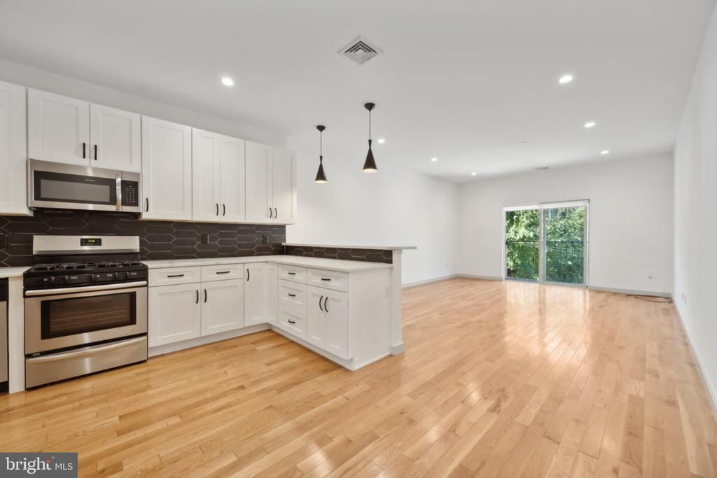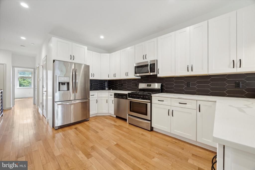 Welcome home to your 3 bedroom and 3 full bath, luxury unit in the friendly and growing neighborhood of Olde Kensington. This newly renovated 3 story townhome boasts high 10' ceilings, an abundance of natural light, light oak colored floors, and oversized windows. The sun-soaked open concept living/dining space makes entertaining easy, as it effortlessly flows into the high end kitchen. The kitchen boasts custom shaker-style cabinetry, stainless steel appliances, quartz countertops, tile backsplash, and a LARGE walk-in pantry, perfect for storage. You will also find a washer/dryer combo on the first floor or added convenience. Down the hallway you will find a good-sized bedroom with an ensuite bathroom with tile flooring, a large soaker tub and custom light fixtures. Make your way up the stairs and you will another spacious bedroom and full bath as well as the master suite, complete with a juliet balcony, seamless glass shower, double vanities and huge closets. The third set of stairs will lead you to a fabulous roof deck with views of Center City. Central A/C through out, an abundance of closet/storage space, recessed lighting and lots of charm! With ample street parking, you are close to Fishtown, Northern Liberties, Center City, and fantastic restaurants and eclectic shopping.