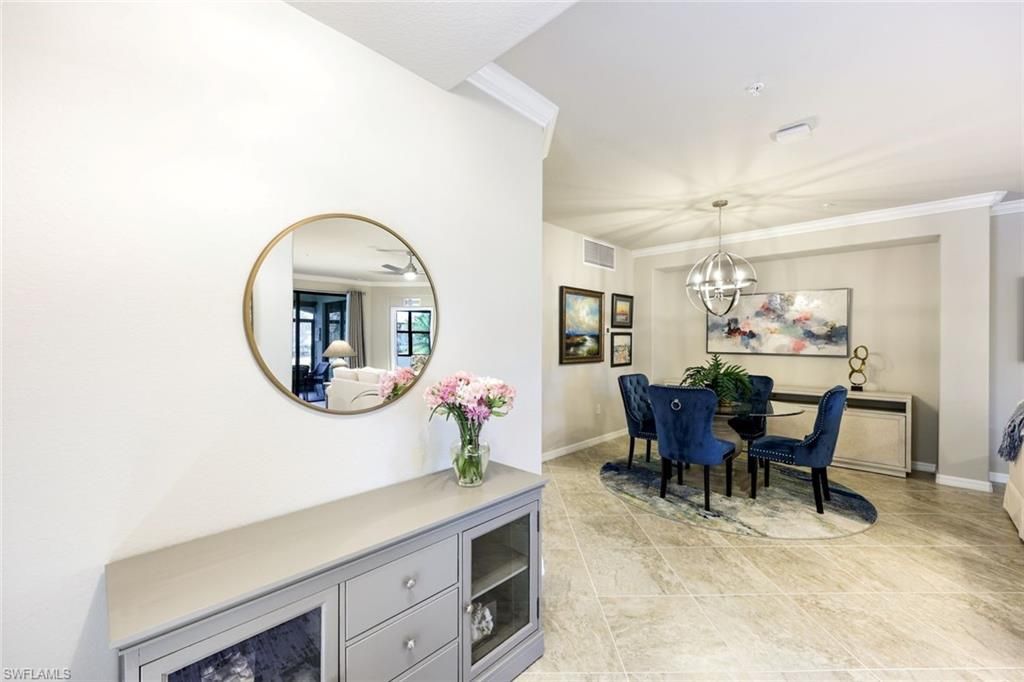 SOCIAL MEMBERSHIP INCLUDED! Welcome to this beautifully appointed 1st-floor corner condo offering 3 bedrooms, 2 full baths, and a 2-car attached garage in the highly sought-after Bonita National Golf & Country Club. From the moment you arrive, the elegant glass insert front door sets the tone for the light-filled interior. Inside, youll find 18-inch tile laid on the diagonal and crown molding throughout the main living areas, complemented by light grey interior paint for a fresh, modern feel. The open-concept layout flows effortlessly into a spacious kitchen featuring a large island with seating for four, white raised-panel cabinetry, white tile backsplash, and stainless steel appliances—perfect for both entertaining and everyday living. The expansive screened-in lanai is designed for true Florida living, complete with fine mesh screens, roll-down shades, and ceramic wood-look tile, offering plenty of room for dining and relaxing while enjoying peaceful lake views. The generous primary suite features private lanai access, two updated closets, and a luxurious ensuite bath with dual vanities, a large walk-in shower with frameless glass door, and a private water closet. The split floor plan provides privacy for guests, with two front guest bedrooms that can be separated from the main living area with a door. Luxury vinyl flooring enhances all bedrooms for both style and durability. Residents of Bonita National Golf & Country Club enjoy access to resort style amenities including a lagoon-style pool with waterfall and lap lanes, poolside cabanas and café, state-of-the-art fitness center, full-service spa and sauna, and a stunning clubhouse with an exciting social calendar offering something for everyone, 21 active clubs you can partake in, two on-site dining venues, game rooms, and more. This exceptional home combines luxury, comfort, and resort-style living—all in one.