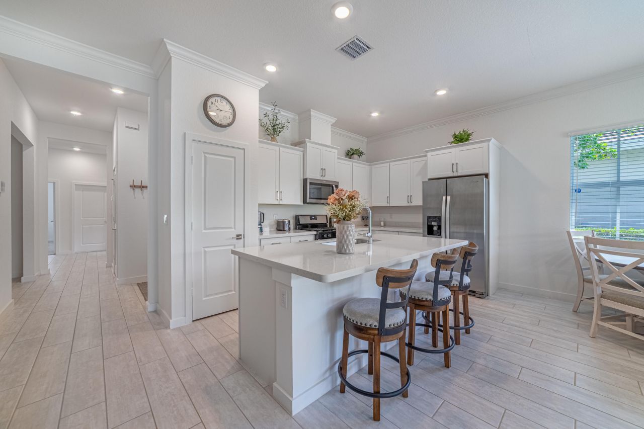 Welcome to a Peaceful Retreat in the Arden Community!This beautiful 3-bedroom with a den, 2-bathroom Villa and a 2-car garage offershurricane impact windows & doors throughout, epoxy garage floors and tankless hot water heater. Kitchen features white cabinets, quartz countertop, stainless steel appliances. Crown molding in living area & the master bedroom.Enjoy relaxing or entertaining outdoors on the covered patio, with an expansive backyard ready for your personal touch. Arden offers resort-style amenities, including two pools, hot tub, fitness center, tennis, basketball and pickle ball courts and so much more.