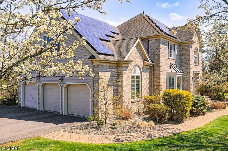 Welcome to 2 Moonlight Trail, a beautifully maintained center hall Colonial set on just over an acre in the desirable Country Classics neighborhood of Raritan Township. This sun-filled home features a dramatic two-story entry with cathedral ceilings, flanked by formal living and dining rooms, along with freshly painted interiors for a move-in-ready feel. The spacious kitchen offers stainless steel appliances, double oven, gas cooktop, granite countertops, a breakfast bar, and ample cabinetry, flowing into an informal dining area and a bright family room with soaring ceilings and a brick fireplace. Step outside to a raised deck, perfect for entertaining or relaxing. The first floor also includes a laundry room and a flexible office or guest bedroom with a full bath. Upstairs, the primary suite features a vaulted ceiling, walk-in closet, and ensuite bath with double vanity, whirlpool tub, and separate shower, along with three additional bedrooms and a hall bath. A finished walk-out basement provides versatile living space, complemented by a three-car garage and energy-saving solar panels, all conveniently located near Flemington, Lambertville, New Hope, and Princeton.