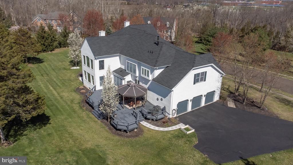 Orleans Eaton model · 5BR, 6 full and 1 half BA · 5,552 sq ft above grade · finished walkout basement · 3-car side-entry garage. Set on 1.03 acres in Montgomery Twp, 206 Van Zandt Road offers a refined take on upscale suburban living with expansive interiors, updated finishes, and outdoor space designed for both entertaining and everyday enjoyment. A dramatic two-story foyer with curved staircase opens to gracious formal rooms, a conservatory, and a first-floor bedroom suite that adds flexibility for guests, work, or extended-stay living. The state-of-the-art kitchen has been fully updated with custom cabinetry, premium appliances, a large center island, and a bright breakfast area overlooking the backyard. The adjoining family room features soaring ceilings, oversized windows, and a striking sense of scale and light. Upstairs, the primary suite is a standout retreat with two en suite baths and multiple walk-in closets. The upper level also includes a Jack-and-Jill bedroom suite and an additional en suite bedroom, offering comfort and privacy across the floor plan. The finished walkout basement adds exceptional lifestyle space with a theater room, rec room, additional finished areas for fitness, hobbies, or play, and a full bath. Outside, the large deck with pergola steps down to an expansive lawn framed by mature trees, creating a private setting for dining, lounging, and entertaining. Built in 2001, this home balances elegance, comfort, and function in a premier Montgomery Twp setting.