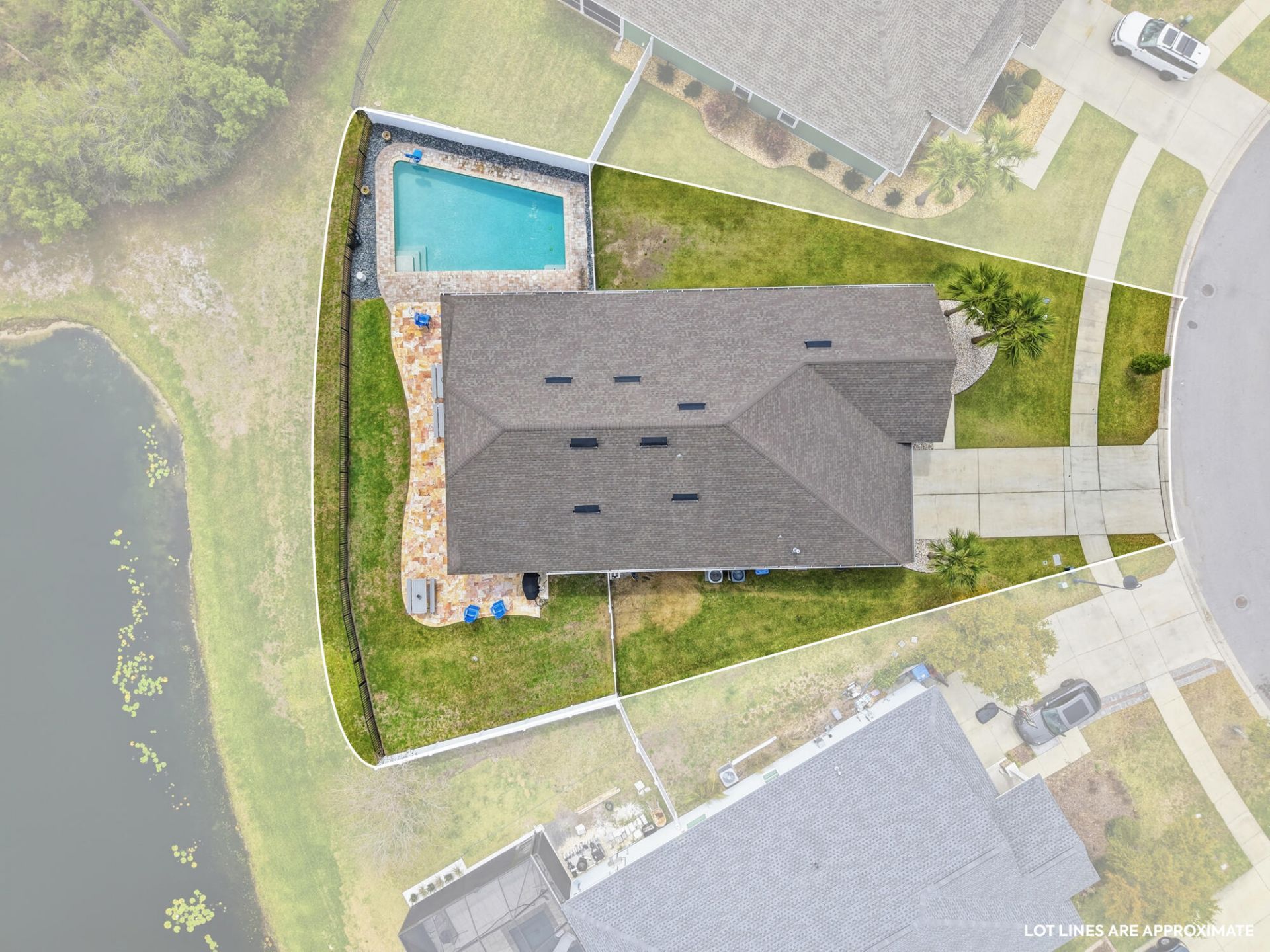 Waterfront home in Breakfast Point offering approximately 3,200 sq. ft., 4 bedrooms plus a bonus room that can function as a 5th bedroom, and a fully fenced yard with a saltwater pool. Interior features include hardwood floors, high ceilings, formal living and dining area with built-in shelving, and a split-bedroom floor plan. The kitchen opens to the main living area overlooking the pond and includes granite countertops, stainless steel appliances, dual industrial refrigerators, a large kitchen island, pantry, built-in desk/workspace, and a reverse osmosis water filter at the kitchen sink. The primary suite is located off the main living area and includes pond views, double vanity, tile walk-in shower, soaking tub, private water closet, and walk-in closet. Two additional bedrooms share a full bath, and the walk-in laundry room offers extensive shelving. The upstairs bonus room includes a half bath and can serve as a media room, office, or additional bedroom. Exterior features include a covered tiled patio, paver pool deck, vinyl privacy fencing, and iron fencing along the pond. Pond is catch-and-release with some good-sized bass. All sizes and measurements are approximate and should be verified if important. Some photos are altered or staged using AI for conceptual purposes. Conveniently located within walking distance to Breakfast Point Academy and near shopping, restaurants, Home Depot, the Breakfast Point sports complex, and approximately 2 miles to the beach.
