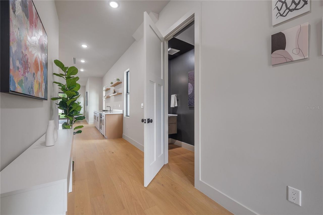 Step into your dream lifestyle with this stunning brand-new construction in the established neighborhood of Ridgewood Park. Just minutes from Downtown Tampa and walkable to Armature Works, this 5-bedroom, 4.5-bath modern masterpiece blends timeless Floridian charm with sleek, contemporary design. From the moment you arrive, the home's curb appeal captivates with its chic exterior color palette, vibrant landscaping, and stylish balconies. Inside, soft natural light pours across engineered oak hardwood floors, enhancing a curated mix of Benjamin Moore designer hues that set an elegant, welcoming tone throughout. The open-concept main level is designed for both entertaining and daily living, featuring a spacious living area with a striking fireplace and a refined dining space complete with a built-in wet bar. At the heart of it all is a gourmet kitchen that will inspire your inner chef-showcasing custom cabinetry, premium hardware, a built-in beverage fridge, Calacatta Gold quartz countertops, and a massive island perfect for casual dining or weekend hosting. Upstairs, the second floor offers two bedrooms and a full guest bathroom, a full private guest suite, and the showstopping primary suite. This luxe retreat boasts a massive custom walk-in closet and a spa-like en suite with a dual-sink vanity and an enclosed wet room featuring a soaking tub-an everyday escape. Ascend to the third floor, and you'll find a space made for unforgettable moments. A huge recreation room opens to an expansive rooftop deck with breathtaking views of downtown Tampa, ideal for hosting under the stars or enjoying quiet mornings in the sun. A large bedroom and full bathroom on this level create flexible living options, perfect for guests or multigenerational households. With a thoughtful layout that includes a top-floor laundry room, ample storage throughout, a covered patio, and a two-car garage-all tucked behind a white vinyl privacy fence-this home delivers on every detail. Live moments from Tampa's best dining, shopping, and entertainment, with quick access to I-275 and top local schools. This is more than a home-it's your opportunity to live exceptionally. Schedule your showing today!