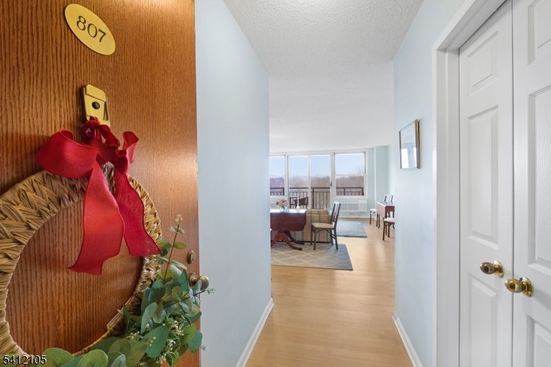 River views set the tone for this upper level residence, enjoyed directly from its private balcony overlooking the water, creating a peaceful outdoor extension of the living space. Entry begins in a true foyer, creating separation from the main living areas and offering a walk-in closet that provides everyday storage. From there, the home opens into a spacious living and dining area, offering a space for both formal dining and casual gatherings. A private balcony extends directly off the living room, providing an outdoor retreat with open views that add depth and dimension to the interior space. Its proportions allow for a full dining set and additional furniture if desired. The galley kitchen is designed with ample cabinetry, granite countertops, stainless steel appliances, and workspace along both sides. The layout maximizes functionality while keeping the kitchen neatly tucked away from the main living areas. The primary suite is generously sized and features a walk-in closet along with an ensuite bathroom. The second bedroom offers flexibility for guests, a home office, or additional living needs. Residents of The Mill enjoy an array of amenities, including a state-of-the-art fitness center, a renovated community room, tennis courts, an in-ground swimming pool, scenic walking and jogging paths, and the plaza deck overlooking the waterfalls. Located near shops, restaurants, and NJ Transit bus and train options, this community offers easy access to NYC and Hoboken.