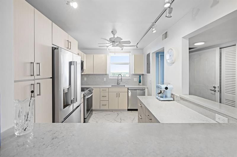Views from every window! Large SW corner penthouse condo located steps away from the Commercial Blvd bridge entrance into LAUDERDALE BY THE SEA. New kitchen, floor to ceiling impact windows, and recent bathroom updates. Only one neighboring condo next door is divided by a solid concrete block wall, providing excellent sound insulation from next door. No neighbor above! Garage parking and ample guest parking. Common area, no fixed bridge/ deepwater dockage is available. Small pets are welcome. Building went through extensive concrete restoration and the roof was replaced in 2025. Great walkability to many restaurants, services and to the beach. Amazing sunsets and downtown views to the southwest and views to the ocean above 3 story height restricted, LAUDERDALE BY THE SEA, to the east.