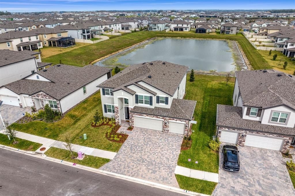 One or more photo(s) has been virtually staged. +++++++This brand-new, never-lived-in home, purchased in 2024, is a true masterpiece featuring over $140K in premium upgrades. Boasting 3,761 sq. ft., this stunning 5-bedroom, 5-bathroom residence is perfectly positioned on a picturesque waterfront homesite in the sought-after Epperson Ranch community. Thoughtfully designed for modern living, this 2024-built home showcases luxury and innovation, including wood plank tile flooring, a 50-amp car charger, a striking 48 electric fireplace, extra LED can lighting, tray ceilings, and a spacious 15x18 balcony. A Smart Home thermostat adds convenience and efficiency. The open floor plan includes two master suites (one upstairs, one downstairs), five full bathrooms, a private den/office, a large family room, and a massive bonus/media room with a pool bath that leads to the oversized screened lanai. The gourmet kitchen is a showstopper with sleek quartz countertops, stainless steel appliances, a large island with drop pendant lighting, double ovens, and a spacious butler's pantry with custom shelving. A flexible space near the kitchen can serve as a formal dining room or additional office. Upstairs, you'll find four generously sized bedrooms, a loft, and a versatile bonus room, perfect for movie or game nights. Step outside to your private backyard retreat featuring an extended screened lanai with breathtaking waterfront views, creating an ideal setting for relaxation and entertaining. Additional features include a three-car garage with epoxy-coated flooring, two automatic garage door openers, a 50-amp circuit for electric vehicle charging, pre-plumbing for a water softener, and reclaimed water for irrigation. Located in the highly desirable Epperson Ranch, residents enjoy access to the Crystal Lagoon, a 7-acre tropical paradise featuring swimming, kayaking, paddleboarding, a floating obstacle course, water slides, a rock-climbing wall, and a sandy beach. The community also offers a swim-up bar and Lagoon Caf? for refreshments. Conveniently located near top-rated schools, shopping, dining, and major highways, this exceptional property offers the ultimate Florida lifestyle. Don't miss this incredible opportunity-schedule your showing today!