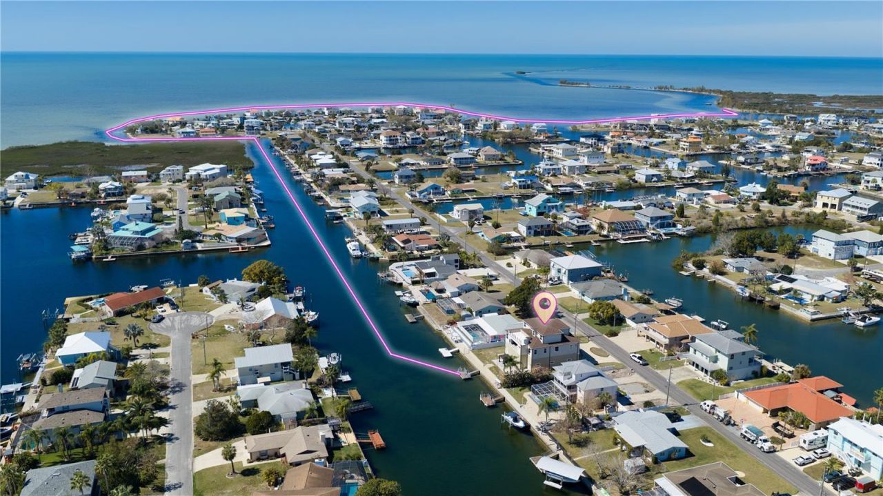 This almost-new home built in 2023 is a stunning custom waterfront residence with ELEVATOR offering 5 BEDROOMS + FLEX SPACE, 5 BATHROOMS, and a 4+ GARAGE on an oversized 9,400+ sq ft DIRECT GULF ACCESS lot with 84 ft of seawall in desirable Hernando Beach. With no HOA, no deed restrictions, and short-term rentals permitted, this exceptional property is ideal as a primary residence, vacation retreat, or income-producing investment.Impressive curb appeal welcomes you with decorative concrete curbing, grand dual staircases, and a tiled front porch. Inside, the bright Great Room features 10 ft CEILINGS, a custom electric glass-front fireplace, and a pre-wired wine display area convertible to a wine cellar. The one-of-a-kind GOURMET KITCHEN offers TWO-TONED CABINETRY with DOUBLE CROWN MOULDING, quartzite countertops, FARMHOUSE SINK, and upgrades STAINLESS STEEL APPLIANCES. The oversized island includes built-in storage and seating, along with a convection oven/air fryer combo. A 6-burner gas cooktop with stainless hood, wraparound buffet with drawer microwave, custom live-edge coffee bar, and oversized walk-in pantry complete this chef's kitchen. The adjacent dining area captures panoramic Gulf views.QUADRUPLE SLIDERS open to a 22x15 covered lanai with decorative ceiling and half bath and pre-plumbed for a future outdoor kitchen, complete with stainless hood. The waterfront primary suite features DUAL WALK-IN CLOSETS WITH CUSTOM SHELVING and a SPA-LIKE BATHROOM with floor-to-ceiling tiled shower, double quartz vanities, with built-in cosmetic and appliance drawers. The second level also includes a laundry room, half bath, and guest bedroom/office.The third level offers three additional bedrooms plus a flex space, all with waterfront views. Two bedrooms share a JACK AND JILL BATH, while the fifth bedroom and flex space access a full bath with tub and shower combo. The first level provides parking for 4+ vehicles with 10 FT GARAGE DOORS and extensive storage. Outdoors, enjoy an epoxy-finished patio, covered pergola, 84 feet of concrete seawall, and floating dock w/ladder on a wide channel suitable for larg boats and sailboats.Thoughtful upgrades include an EV CHARGING PORT, gas line for a future whole-home generator, pre-run gas and electric for a pool, electric for a future boat lift, exterior lift wiring to the third-level deck, and pre-plumbing for a future second-level pool and rear deck. Located minutes from Weeki Wachee Springs with easy access to Suncoast Parkway for commuting to Tampa, this golf-cart-friendly community offers boating, kayaking, paddleboarding, and fishing right from your backyard.Coastal luxury, investment potential, and direct Gulf access-schedule your private showing today.
