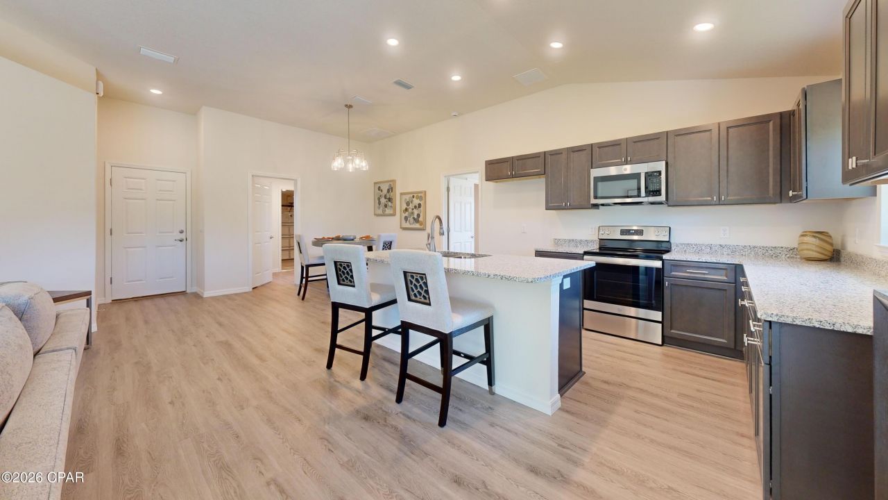 Seize the rare opportunity to own the model home--the Lavender floorplan by Homes by Deltona--beautifully situated in the tranquil community of Sunny Hills. This four-bedroom, two-bathroom gem is not just a house, but a showcase of top-tier upgrades, including an elegant backsplash, high-quality kitchen appliances, custom blinds, and more. As you step inside, you're greeted by a spacious open concept living area, crowned with a majestic, vaulted ceiling that elevates the home's aesthetic. The kitchen, designed to satisfy any culinary enthusiast, boasts a central island, sleek granite countertops, and state-of-the-art GE appliances such as a garbage disposal, fridge, dishwasher, range, and over-the-range microwave. The home features luxurious and practical luxury vinyl plank (LVP) flooring throughout the living areas, enhancing both style and durability. Each bedroom offers 9-foot ceilings, creating an open and airy atmosphere, complemented by soft, cozy carpeting for a serene escape. Constructed with sturdy concrete block, this residence promises durability and longevity. The intelligent split bedroom floor plan provides privacy and comfort, with a master suite that includes a large walk-in closet and dual vanity sinks--ideal for relaxation. Step outside to a professionally landscaped yard with an efficient irrigation system, ensuring that your green space thrives beautifully all year long. Additionally, enjoy the confidence that comes with a 10-year builder's warranty. Located in the peaceful Sunny Hills, yet a brief drive from the stunning beaches of the Emerald Coast, this model home is a perfect blend of tranquility and accessibility. Don't miss out on making the Lavender floorplan your forever home!