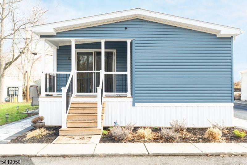 This gorgeous unit is less than 3 years young and includes many builder upgrades that include crown molding, extended kitchen island, for extra counter space and seating, deeper kitchen sink, vaulted ceiling over the kitchen, eating area and living room, recessed lighting package, upgraded vinyl flooring and siding and the covered maintenance-free front porch with sliders. Seller has since upgraded the living room ceiling fan, toilets, plus beautiful paver walkways on both sides of the unit and a patio for a grill. Private shed for additional storage. Unit shares paved driveway with neighbor, has 2 exclusive off-street parking spaces. All utilities from 2023. Monthly lease payment includes land lease, water, sewer, trash, recycling, and snow removal - owners must clear snow from their own driveways and maintain their lawn.