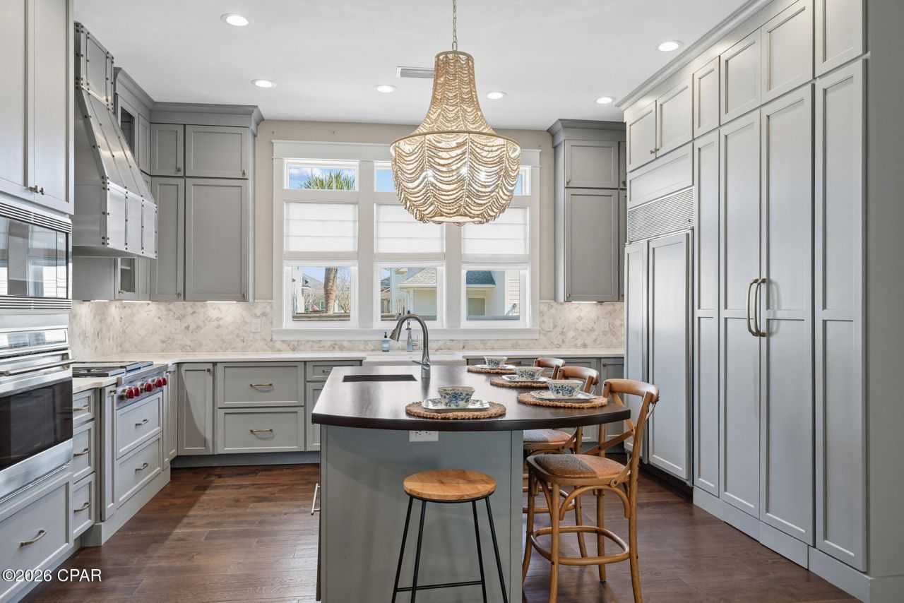 This STUNNING 4/3 custom craftsman has a unique plan featuring 2 bedrooms (including owner's suite) with full baths on the first floor as well as 2 beds and a Jack & Jill full bath upstairs. Eat in kitchen with 2 Kohler sinks, Wolf gas range, custom hood with ventilation, wine chiller, 2 built in refrigerator drawers, under counter freezer, Sub Zero large fridge, and walk-in Pantry! Palecek cabrillo chandelier with tiny hand sewn coconut shell beads. Beachside Tapestry Park has beautiful mature trees, paved streets, 2 community swimming pools, tennis/pickleball courts, basketball courts, clubhouse & playground. All this plus the beach is less than 1 mile away! HOA includes cable TV, internet, trash service. This is the elegant beach sanctuary you've been searching for!