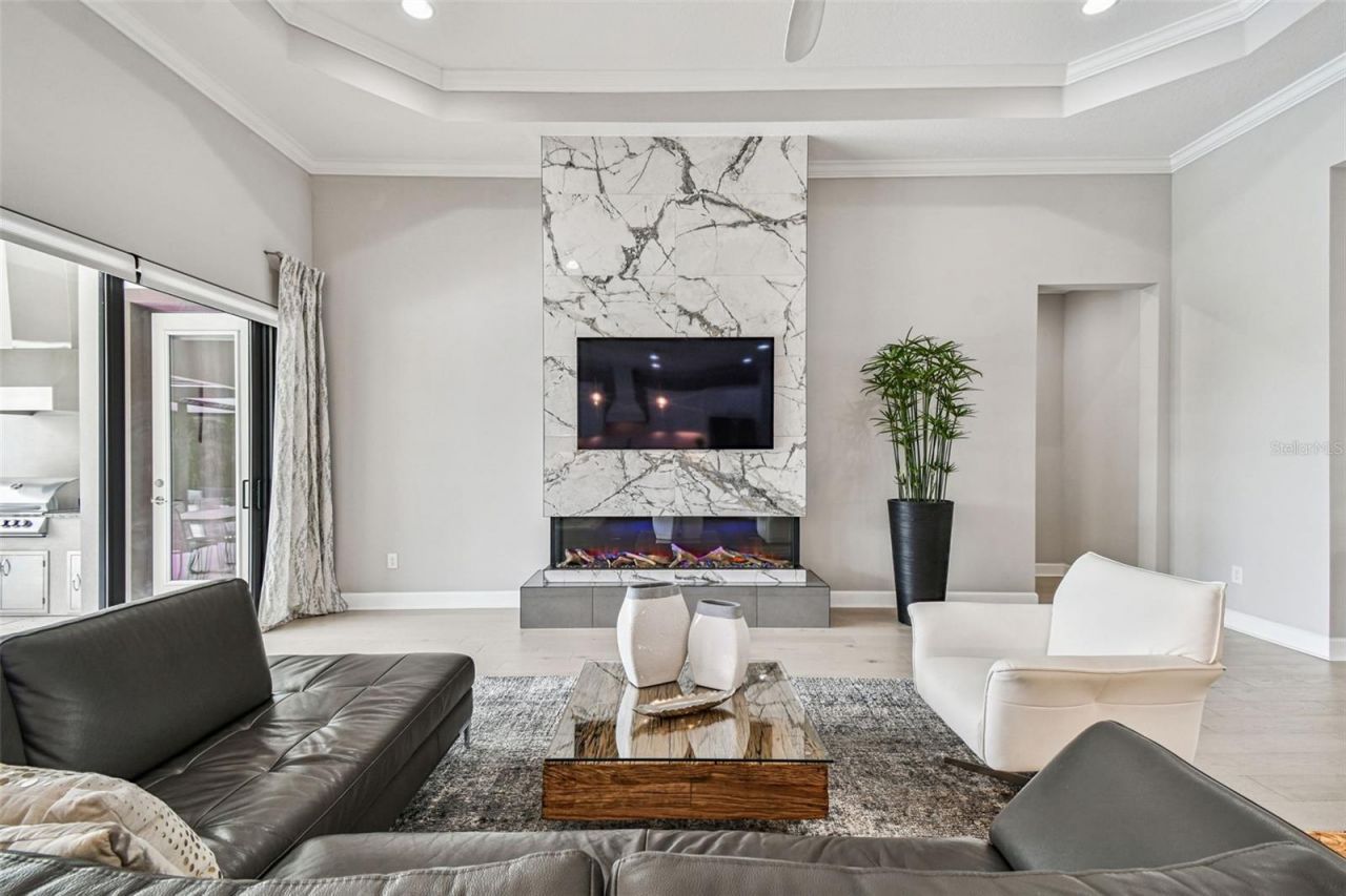 Minutes from Veterans Highway, Tampa International Airport, International Plaza, and world-class Tampa dining, this refined waterfront luxury home has thoughtful details, high-end finishes, and resort-style amenities. A private Mediterranean-style courtyard welcomes you home with a serene sitting area, water feature, and ambient bistro lighting. Inside, hardwood floors and sophisticated crown molding flow throughout the first floor, creating a cohesive and elevated aesthetic. The formal dining room and family room both have beautiful tray ceilings with the living room having a gorgeous marble-faced electric fireplace and wonderful pool and water views. At the heart of the home, the chef's kitchen is both stunning and functional, featuring marble countertops and backsplash, custom drop lighting, and a large island with bar seating and electrical outlets. Stainless steel appliances, a breakfast nook, butler's pantry, wine refrigerator, and a spacious walk-in pantry complete this exceptional culinary space. The luxurious first-floor primary suite serves as a private retreat, enhanced by a dedicated sitting area and private access to the back patio. The spa-inspired primary bath boasts dual marble-topped vanities, a built-in makeup counter, a walk-in shower with dual showerheads, and a private water closet. Dual walk-in closets with custom closet systems offer exceptional storage and organization. Bedrooms two through four are thoughtfully designed with plush carpeting and walk-in closets, providing comfort and privacy for family and guests. Bedroom two features a private ensuite bath with a marble-topped single vanity and walk-in shower, while Bedrooms three and four share a well-appointed Jack-and-Jill bathroom. Upstairs, a versatile loft offers additional living or entertainment space, complete with a full bath and walk-in closet-ideal for guests or a secondary suite. Outdoors, the property transforms into a true waterfront oasis designed for year-round enjoyment. A covered back patio and expansive paver deck overlook the stunning saltwater infinity-edge pool and spa (2021), complemented by a pergola with gas fireplace (2021). The outdoor kitchen is fully equipped with a gas grill, mini refrigerator, range hood, and sink - perfect for entertaining. Beyond the patio, a large greenspace leads to a private dock and 10,000-lb boat lift, offering effortless access to the water. Additional features include a Ring doorbell, a three-car split garage, and a paver driveway. The home is built up for peace of mind and experienced no water intrusion or power outages during the 2024 hurricane season. This extraordinary home delivers timeless elegance, modern comfort, and an unparalleled waterfront lifestyle.