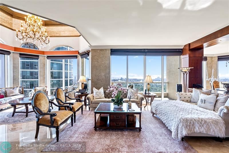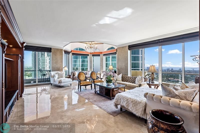 Elegantly Re-Imagined Corner Penthouse, offered fully furnished, boasts 4,200 +/- total sqft of European refinement with sweeping views of the Ocean, New River, and Cityscape. Atop Las Olas Grand, the premier address of downtown, this sophisticated split-plan residence was refitted with the finest materials & finishes across 3 Bedrooms plus an Office/Den, and 3 Full & 1 Half Bathrooms. Features include a handsome Poggen-Pohl kitchen with luxe Appliances, Control4 Smart Home automation for lighting, shades, HVAC, scenes, video and Bowers & Wilkins audio, Swarovski Crystal Chandeliers & fixtures, and volume 10’ – 16’ ceilings with inlaid mother of pearl accents and imported stones. Other amenities include 3 convenient Garage Bays and a huge 8’x24’+/- climate-controlled storage/hobby room.