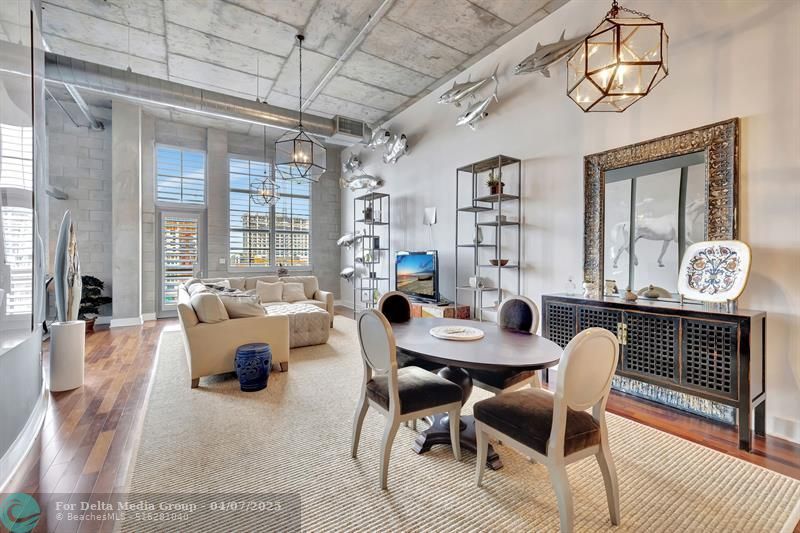 Come home to this exceptional urban-industrial penthouse loft in Fort Lauderdale’s vibrant FATVillage Arts District. Featuring soaring 15-foot concrete ceilings, exposed A/C ducts, and expansive impact windows that flood the space with natural light, this residence offers an authentic loft aesthetic with modern comfort. Custom wood blackout shutters provide both privacy and elegance.The open-concept layout showcases rich hardwood floors throughout, a well-appointed kitchen with gas cooking, and spacious dining and living areas—ideal for both everyday living and entertaining. The two-bedroom, two-bathroom design includes a primary suite with a generous walk-in closet featuring a built-in shelving system, and a contemporary bathroom with dual vanities and a glass-enclosed shower.