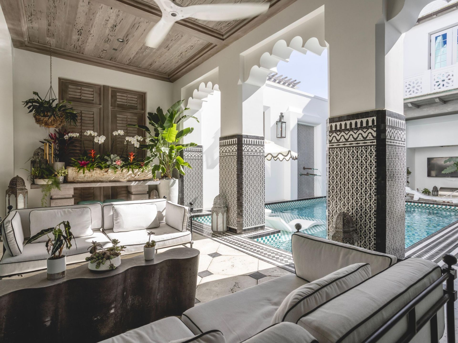 This exceptional residence offers an elevated take on coastal living, thoughtfully designed for both refined entertaining and effortless everyday comfort. A cohesive vision, curated with global influences, brings depth and character to each space, creating a home that feels both sophisticated and inviting. At its center, the kitchen is a true focal point, featuring custom wood cabinetry, a striking blue-and-white tile backsplash, and a suite of premium appliances, setting the stage for both casual gatherings and elevated culinary experiences. The expansive island, complemented by sculptural seating, creates a natural connection between the living and dining areas, encouraging a seamless flow throughout the home. The home is complemented by custom Karpaty cabinetry and a carefully curated selection of designer furnishings, including pieces inspired by and sourced through Melanie Turner Interiors and Kelly Wearstler furnishings, adding depth and sophistication throughout.Outdoor living is equally compelling, with two resort-style pools and hot tubs designed for both relaxation and entertaining. The central courtyard serves as a private sanctuary, framed by intricate tilework and elegant archways, and enhanced by an integrated bar and grilling area--an ideal setting for quiet moments or lively gatherings.A charming casita offers a private retreat for guests, complete with a bedroom and full bath, allowing for comfort and privacy while remaining connected to the main residence. Expansive nano doors open to a beautifully integrated outdoor living space, creating a seamless transition between indoor and outdoor environments.The rooftop level provides an additional layer of luxury, featuring a heated pool, fire pit lounge, outdoor bar, and grilling station, all set against sweeping views of Alys Beach. The owner's suite is a tranquil retreat, enhanced by custom mural work and a spa-inspired bath with refined finishes and a sculptural soaking tub. A private office, positioned just off the balcony, offers a quiet space with serene courtyard views.Two additional guest bedrooms with en-suite baths are located on the second floor, one featuring a Juliet balcony overlooking the courtyard. An elevator provides convenient access to all three levels, enhancing the home's livability.Thoughtfully designed with both form and function in mind, the residence includes ample storage, a well-appointed layout, and discreet luxury throughout. Additional features include DensArmor Plus mildew-resistant drywall, a hidden whole-home surround sound system, and bespoke lighting. Dedicated parking for two vehicles is provided in a rear motor court.Ideally positioned near Palmera Park, Caliza Pool, and Gulf Green beach access, the home is just a short stroll to the owners' Beach Club, offering effortless access to the white sands and emerald waters of the Gulf.