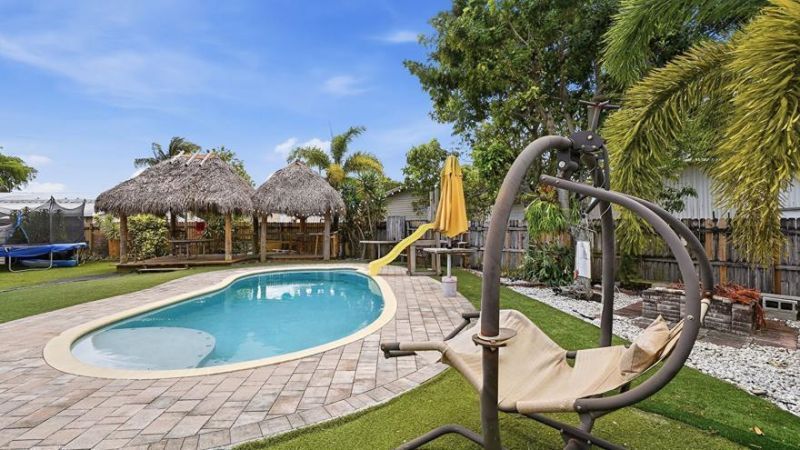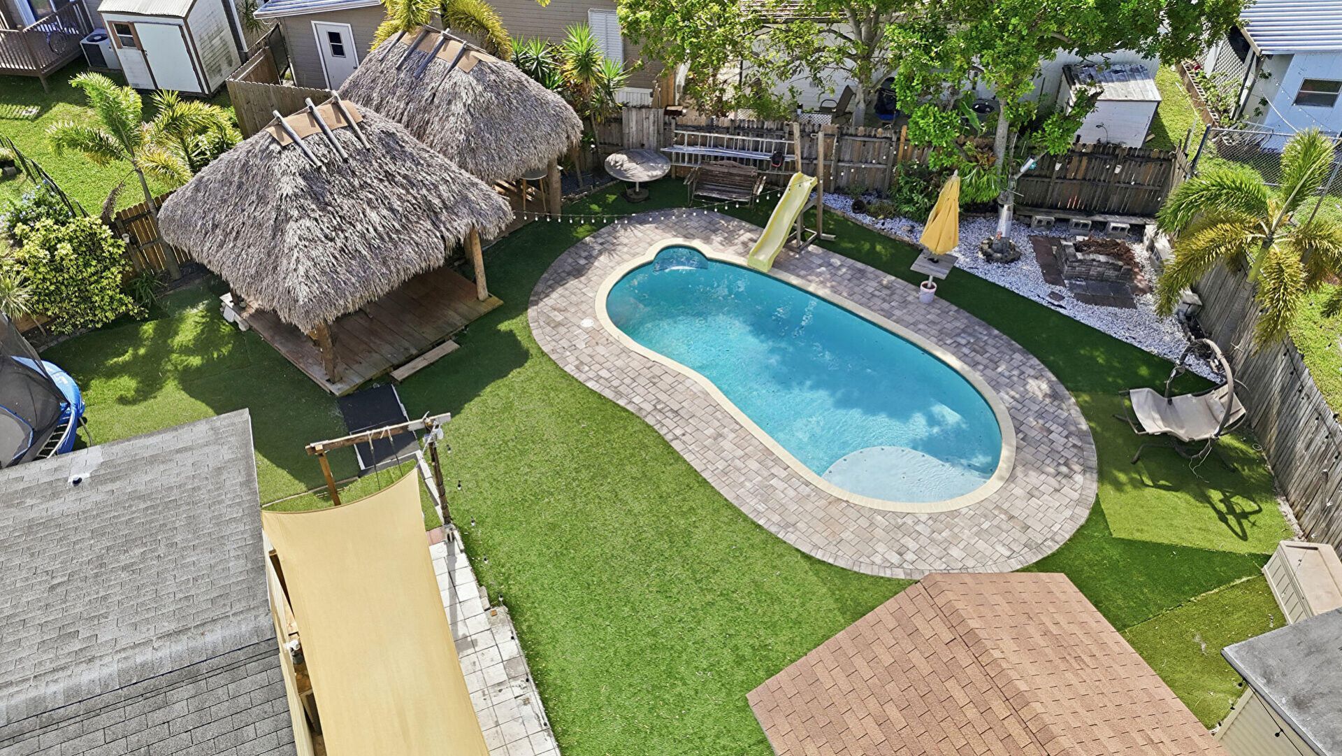 This standout home sits on an oversized corner lot offering privacy, space, and exceptional outdoor living. Relax in your backyard oasis with an inground pool, 2 tiki huts, and a fully fenced yard. Inside features an open layout with spa-style shower, a jacuzzi tub, new floors, custom countertops, and inviting living areas. Includes 2 sheds for added storage, one brand new. Enjoy backyard access to Patrick J. Meli Park. Community offers pool, playground, tennis, pickleball, and clubhouse. Quiet location near beaches, I-95, Hard Rock, Fort Lauderdale Airport, restaurants, shopping, and Tri-Rail.