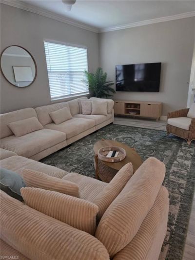 This light and bright second-floor carriage home is ready for you to start enjoying the Florida lifestyle. Inside, youâ??ll find an open living space with plank tile flooring, high ceilings, and crown molding that give the home an airy, welcoming feel. The kitchen features white raised-panel cabinetry, granite countertops and backsplash, and stainless steel appliances, including a sleek low-profile range. A cozy breakfast nook, surrounded by windows on three sides, is the perfect spot to start your day. The spacious primary suite offers sliding doors to the lanai, a private bath with dual sinks, a separate tub and shower, and a generous walk-in closet. Guests will enjoy their own space with a comfortable second bedroom and nearby bath. The third bedroom, with French doors, easily doubles as a home office or den. Step out onto the screened balcony and take in the peaceful lake views. Portofinoâ??s convenient location puts you close to shopping, dining, ballparks, Six Mile Cypress Slough.