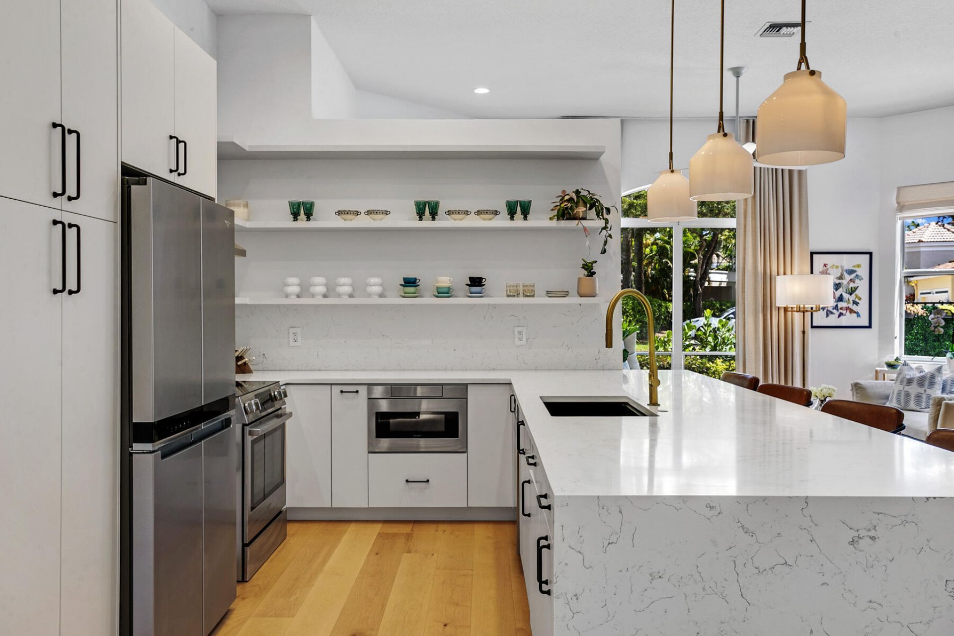 Renovated and light-filled, this townhome in Larkspur Landing at The Club at Ibis offers a move-in ready opportunity within one of Northern Palm Beach County's premier gated country club communities. Thoughtfully redesigned with a clean, modern point of view, the residence blends comfort, quality, and ease in a setting that feels both peaceful and connected. Eleven-foot ceilings and wide plank maple engineered hardwood floors bring warmth and volume throughout. The layout includes two bedrooms, two baths, and a den, offering flexibility for guests, a home office, or additional living space. Just steps from the pool, with a private gated patio framed by lush landscaping, this is a rare opportunity to enjoy updated living within a private golf, tennis, and pickleball community in West Palm Beach. The work has already been done, allowing for immediate enjoyment without the time or cost of renovation. Set within the intimate Mediterranean enclave of Larkspur Landing, this renovated townhome is defined by natural light, strong proportions, and a refined material palette. From the moment you enter, the home feels open and calm. Eleven-foot ceilings elevate the interiors, while wide plank maple engineered hardwood flooring creates warmth, continuity, and a polished foundation throughout. The kitchen is centered around a quartz waterfall island with seating and is finished with matte white European-style cabinetry, integrated storage, and a generous pantry. Bosch and Whirlpool appliances are seamlessly incorporated, creating a space that feels crisp, functional, and well resolved. It is equally suited for everyday living, working from home, or easy entertaining. The primary suite is composed as a private retreat. Its bath features a freestanding soaking tub, glass-enclosed shower, polished nickel fixtures, a Restoration Hardware double vanity, and white terrazzo floors that bring texture and quiet elegance. The overall effect is timeless and understated. The second bedroom includes custom built-ins, while the second bath continues the same clean, tailored palette. A separate den offers flexibility as a home office, reading room, or guest space. The main living areas extend naturally to a private, gated patio framed by bougainvillea and mature landscaping. Just steps from the Larkspur Landing pool, the setting feels peaceful and tucked away, creating an easy indoor-outdoor rhythm that is especially appealing in Palm Beach County. Additional features include custom closets throughout, window treatments, curated lighting, storm protection including hurricane panels, a full laundry room with Maytag washer and dryer, a new 2025 air conditioning system, and a two-car garage with an epoxy floor finish. Recognized as a Platinum Club of America, The Club at Ibis offers one of the most complete country club lifestyles in Northern Palm Beach County. Life here is structured around ease, with golf, racquet sports, fitness, dining, and social programming naturally integrated into daily living. Residents enjoy three Nicklaus family designed golf courses, a modern fitness center, full-service spa, and a highly regarded tennis and pickleball program with clinics, instruction, and organized play. Dining and social life are central to the experience, with venues including the Bistro, Pub, Amici, and Panache, along with weekend brunch and a full calendar of seasonal events. Pools, fitness classes, and a broad range of recreational offerings support both active and relaxed living. Larkspur Landing is especially valued for its quieter, more intimate setting within the community. Mature landscaping, a residential scale, and close proximity to the Club's main amenities create a balance of privacy and convenience that is increasingly hard to find. Renovated homes in Larkspur Landing with this level of finish and proximity to the pool are not often available. The location offers convenient access to both West Palm Beach and Palm Beach Gardens, along