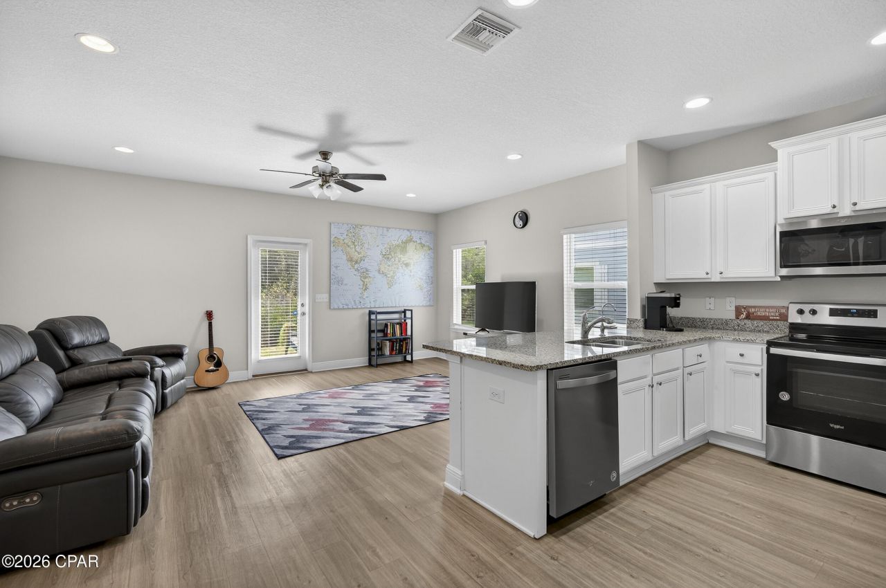 Enjoy the best of Panama City Beach living in this beautiful 3BR/2. 5BA corner unit residence in the desirable Hathaway Townhomes on the east end of the city. Just minutes from the Navy Base, Publix Sports Park, and the Gulf's white-sand beaches, this location makes commuting, recreation, and weekend escapes effortless. The bright, open first floor features a welcoming living and dining space with 10' ceilings and a designer lighting package that enhances the airy, spacious ambiance. The kitchen flows seamlessly from this space and offers granite countertops, stainless steel appliances, custom cabinetry, and a water filtration system. A convenient half bath is located just off the kitchen. Modern convenience and security are built in with a Smart Home package, including keyless entry, Skybell doorbell, automated front porch lighting, an Echo Dot, and a Quolsys touch panel for controlling lighting, doors, thermostat, and more. Upstairs, the primary suite includes a walk-in closet and private ensuite with a luxurious shower, while two additional bedrooms share a well-appointed bath, providing comfortable and private space for family, guests, or a home office. A one-car garage provides secure parking and storage, with additional driveway space for multiple vehicles. The community offers a resort-style pool and fully maintained landscaping, with the HOA covering personal lawn care, trash service, and upkeep of common areas, giving you a low-maintenance lifestyle. Pets are welcome and short-term rentals are allowed with a one-week minimum, making this townhome a flexible option for both personal living and investment potential.