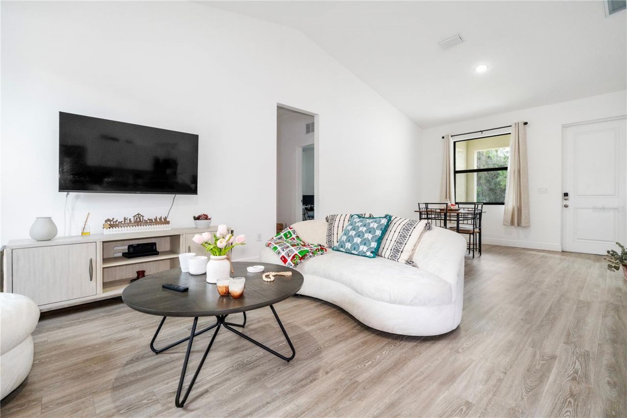 This beautiful 3-bedroom, 2-bathroom home, built in 2022, is located in the growing community of LaBelle, Florida, and sits on a spacious 1/4-acre lot with a 2-car garage. Designed with comfort and style in mind, the property features an open-concept kitchen with elegant high-gloss white cabinetry, stainless steel appliances, and granite countertops, seamlessly flowing into the main living areas. The home offers waterproof laminate flooring throughout, thoughtfully selected to complement the granite surfaces and neutral wall colors. Both bathrooms are fully tiled and feature modern vanities with granite countertops and refined finishes. High ceilings throughout the property enhance the sense of space and natural light, while impact-resistant windows and doors provide added security and energy efficiency. As a newer construction, this home offers long-life systems and the benefit of more affordable property insurance. Additional features include a complete ADT security system with cameras and door and window alarms, a washer and dryer, and partial furnishings, including a living room set, dining table, sofa, and more-all included in the sale. This move-in-ready home combines modern design, quality construction, and valuable upgrades, making it an excellent opportunity for homeowners or investors alike.