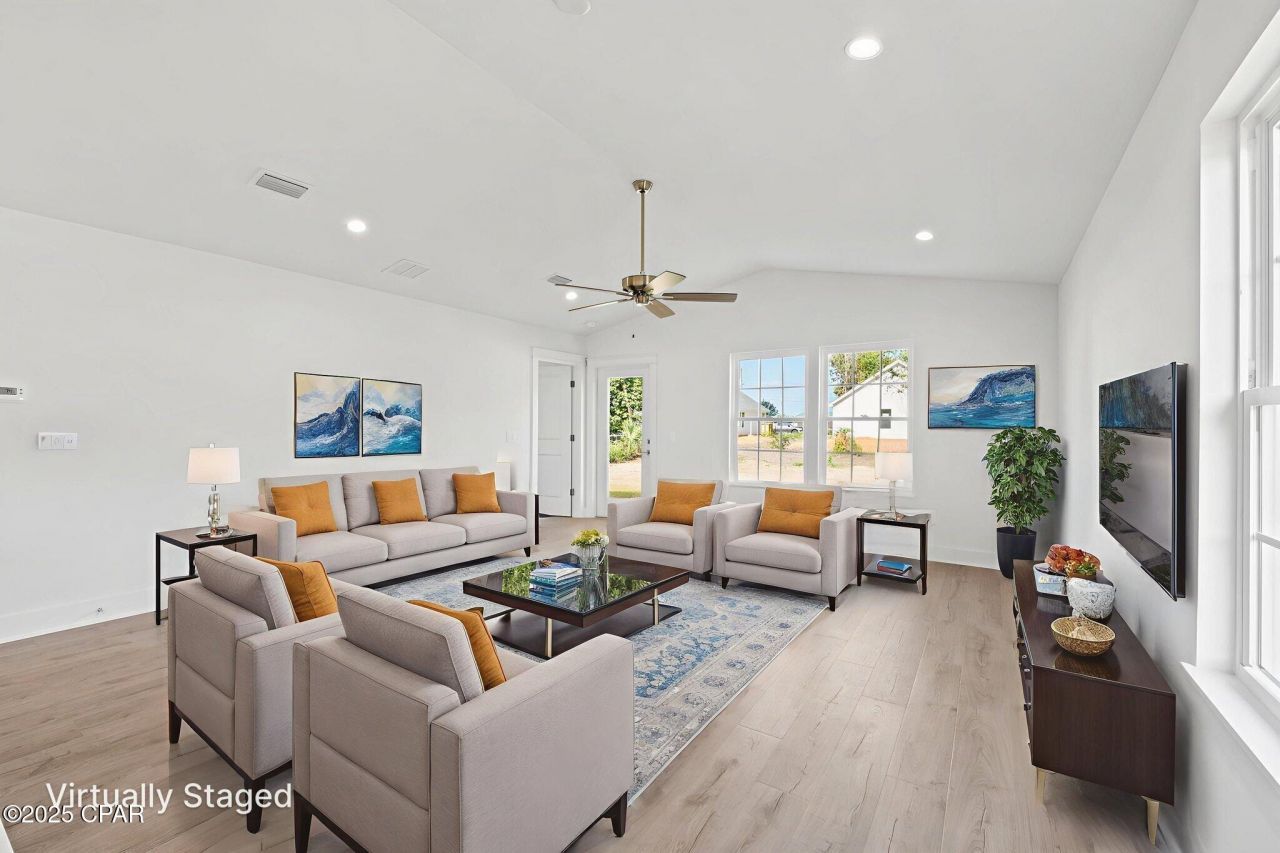 This thoughtfully designed cottage home in Panama City is a smart move for anyone looking for quality, comfort, and convenience. This 3 bedroom, 2 bathroom open concept floor plan is a great starter home. A one car garage with plenty of storage and an expansive lot for creating your own backyard oasis. Just minutes from Tyndall Air Force Base, public boat ramps, parks, and all the essentials of town, this location offers the best of both peace and practicality. Step inside to vaulted ceilings, tons of natural light, and an open-concept layout that feels spacious yet inviting. The kitchen delivers serious style with sleek quartz countertops, stainless steel appliances, soft-close shaker cabinets, and a large island perfect for hosting or your morning coffee routine. Durable vinyl plank flooring runs throughout. No carpet = no stress or mess. The split-bedroom floor plan gives you privacy where it counts. Outside, enjoy fresh landscaping, a wide driveway, one-car garage, and no HOA, which means no restrictions on your boat, trailer, or weekend toys. Whether you're a first-time buyer, military relocation, or investor looking for a strong rental, this brand-new build checks all the boxes. Don't miss your chance to get into a new home without the wait. Schedule your showing at 925 Bonnie Lane today and see what easy living looks like.