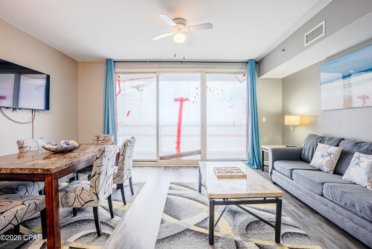 Welcome to Shores of Panama in beautiful Panama City Beach. This Gulf front 2-bedroom condo with additional hall bunks includes a highly sought-after assigned parking space and offers west-facing sunset views. From the private balcony, enjoy a direct overlook of the signature lagoon-style zero-entry pool surrounded by tropical landscaping, bridges, hot tub, and the iconic dolphin fountains. Inside, the condo has been recently painted and updated with durable vinyl plank flooring throughout. The open kitchen features granite countertops, a breakfast bar, and a pantry for extra storage. With 2 bedrooms, hallway bunk beds, and a sleeper sofa, this unit comfortably accommodates guests and is ideal for rental income or personal use. The floor plan includes three full bathrooms, providing added convenience for owners and guests. Resort amenities include the expansive outdoor pool area, two poolside tiki bars and a grill, an indoor pool and hot tub, a well-equipped fitness center, and an outdoor grilling/picnic area. Renovations to the building exterior are currently underway.